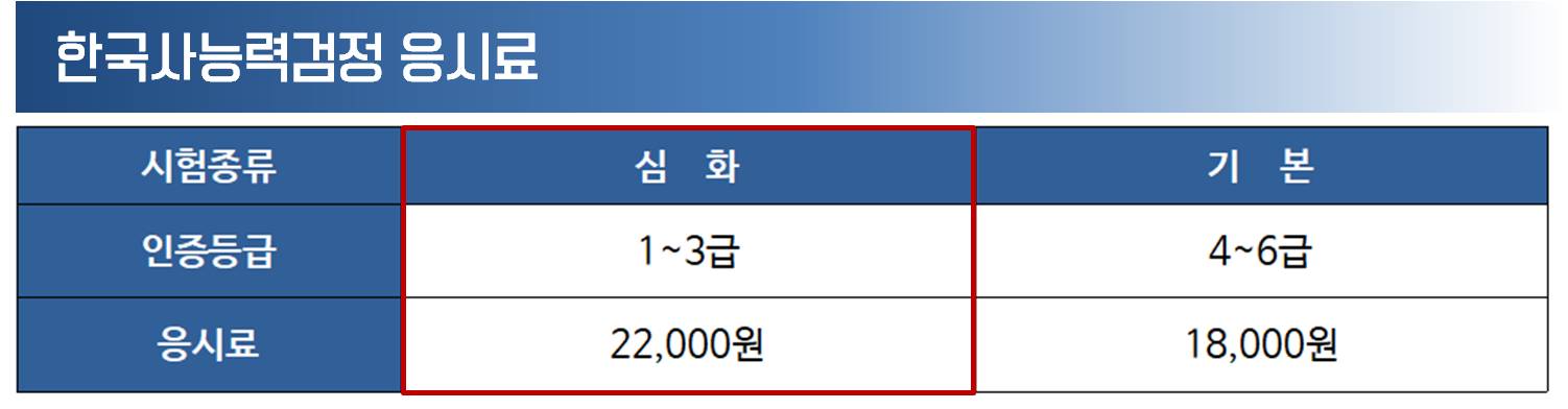시험은 과거에는 초급, 중급, 고급의 3단계로 나뉘어 있었으나 2020년부터는 심화와 기본으로 통합되었습니다. 각종 채용 및 공무원 자격인증·가산점과 관련한 시험은 심화로 응시하시면 됩니다. 응시료는 심화 22,000원 / 기본 18,000원입니다.
