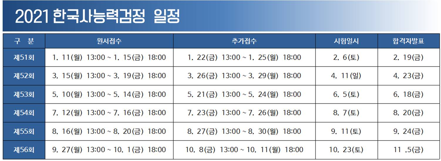 2021년 한국사능력검정은 총 6회가 진행됩니다. 추가 접수의 경우 원서접수기간 마감 후 잔여석에 대해서 진행합니다.