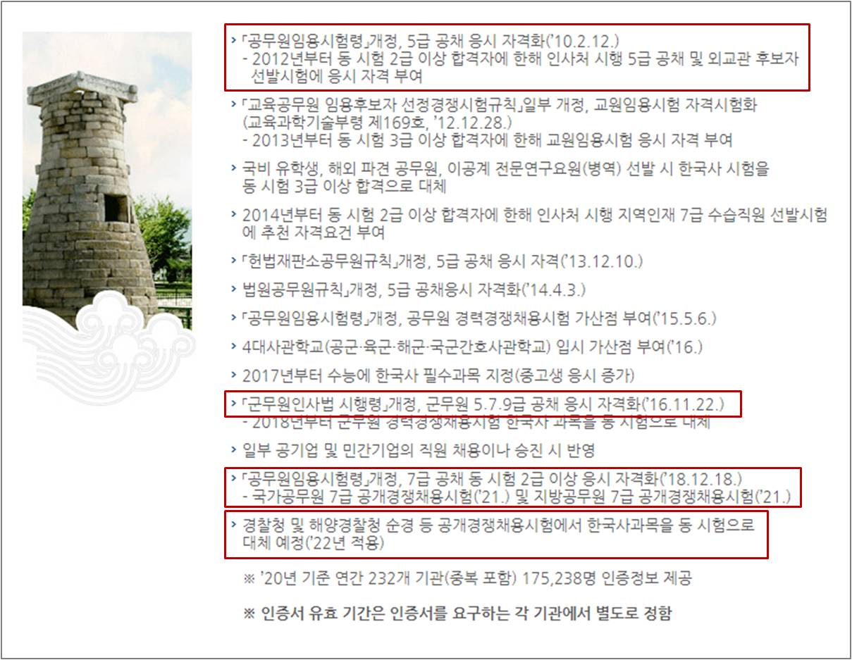 해당 시험은 각종 채용에서 자격인증으로 활용되며 특히 군무원(5,7,9급) 공채시험 응시자격인증과 2022년에는 경찰 채용과 관련하여 한국사 과목이 자격인증으로 변경되는 것으로 예정되어 있습니다.