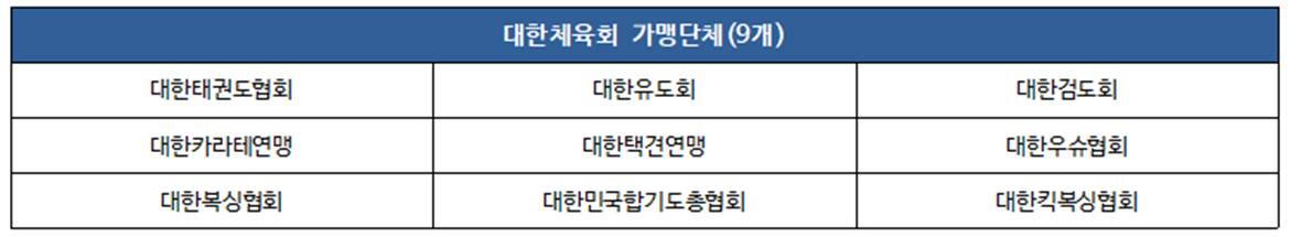 다음은 무도분야와 관련하여 가산점 인증이 가능한 총58개의 단체입니다. 확인하시고 인증이 불가능한 단체라면 다른 분야의 가산점을 더 취득해 주시기 바랍니다.