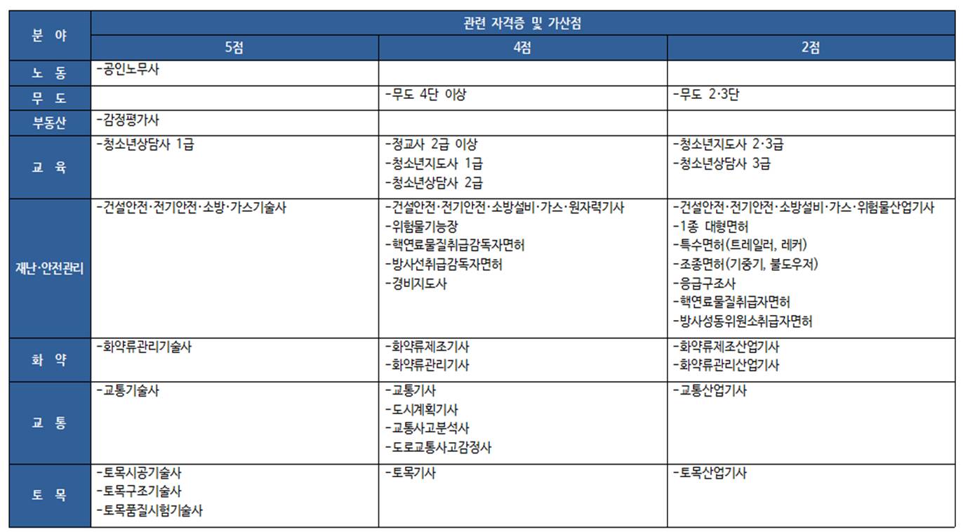 가산점 기준표를 확인하고 자신이 보유하고 있거나 취득해야 할 자격증을 파악하고 최대한 5점을 맞출 수 있도록 준비해 주시기 바랍니다.