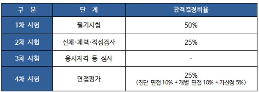 최종 합격자 결정은 필기시험이 50%, 체력겸사 25%, 면접시험 25%의 비율로 합산하여 결정됩니다. 이때 가산점 부분은 면접시험에 포함되며 상당히 큰 부분을 차지하고 대부분이 5점을 받기 때문에 필수적으로 획득하여야 하는 점수입니다.