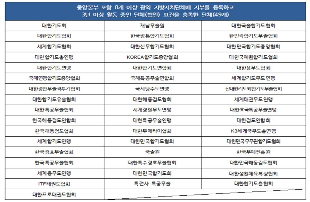 다음은 무도분야와 관련하여 가산점 인증이 가능한 총58개의 단체입니다. 확인하시고 인증이 불가능한 단체라면 다른 분야의 가산점을 더 취득해 주시기 바랍니다.