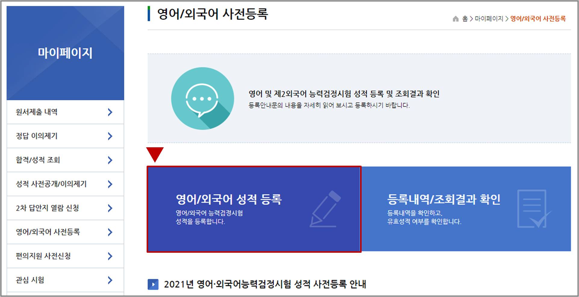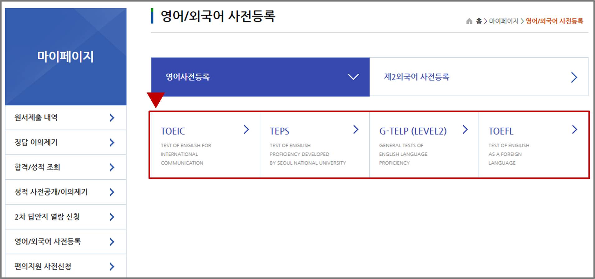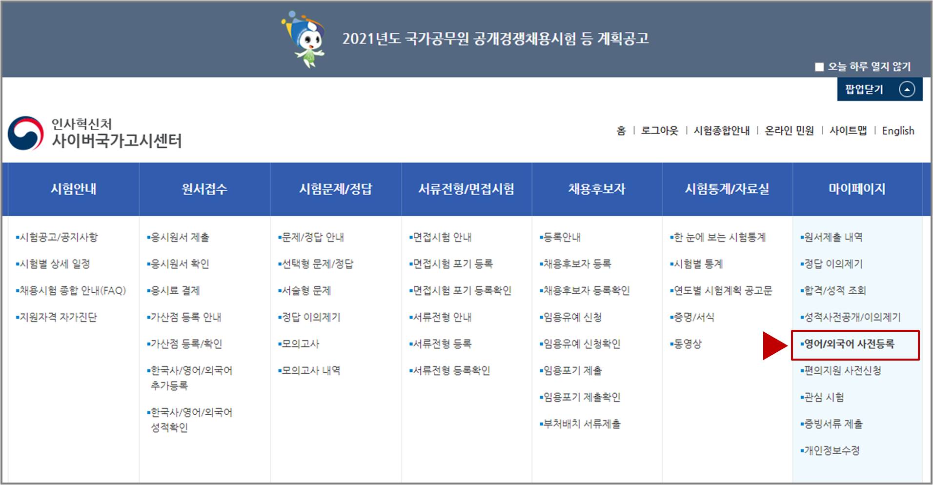 인사혁식처 사이버국가고시센터 홈피이지(www.gosi.kr) 방문 → 회원가입 → 마이페이지 → 영어/외국어 사전등록