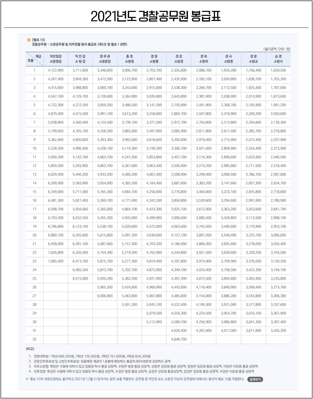 2021년도 경찰공무원 봉급표(인사혁신처 공개)