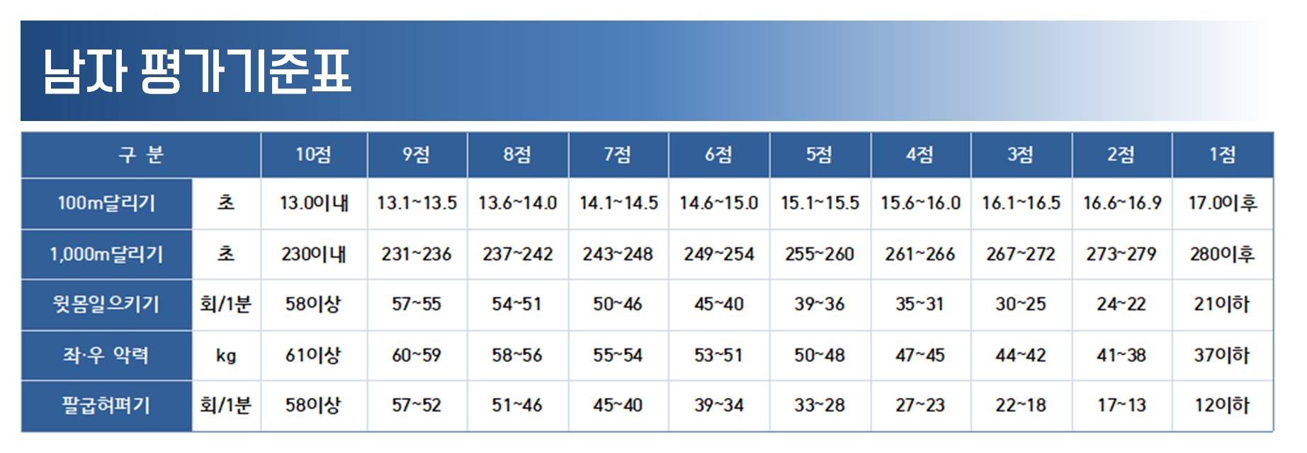 체력평가는 총 5가지(100m 달리기 / 1000m 달리기 / 윗몸일으키기 / 팔굽혀펴기 / 좌우 악력) 부분으로 평가가 이루어집니다.