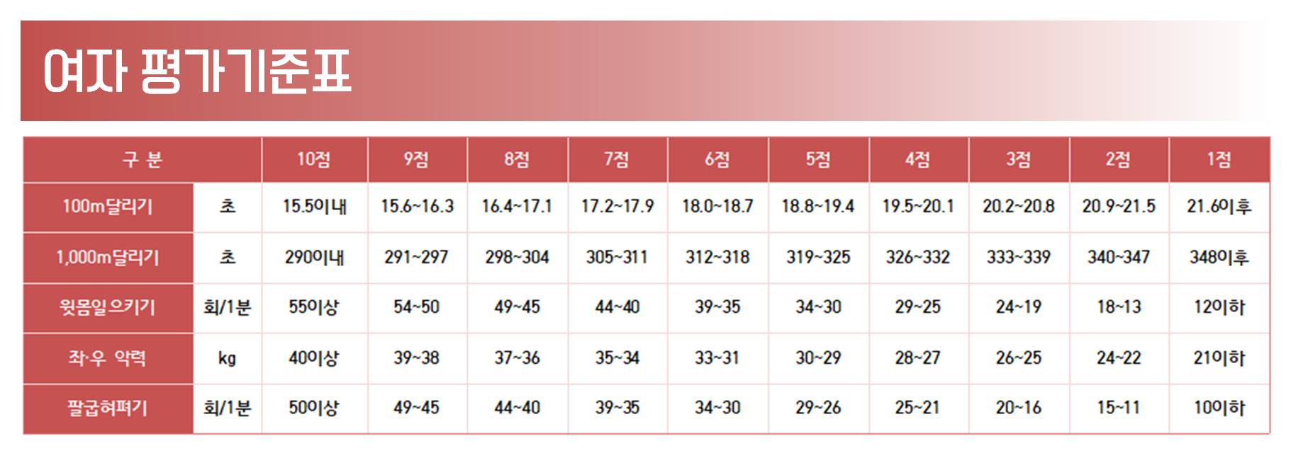 - 팔굽혀펴기 : 1분 동안 실시한 횟수를 측정하며 여자의 경우 무릎을 대고 실시합니다.