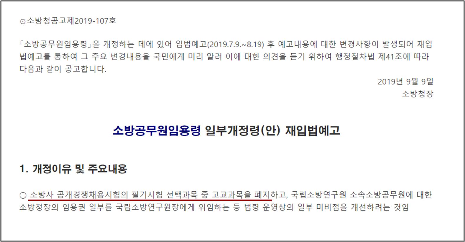 소방사 공개경쟁채용과 관련하여 과목개편이 진행될 예정입니다. 해당 내용은 2019년에 입법예고를 하였으며 2022년부터 시행 예정입니다. 오늘은 개편의 배경과 어떠한 과목이 어떻게 개편되는지에 대해 한 번 알아보도록 하겠습니다.